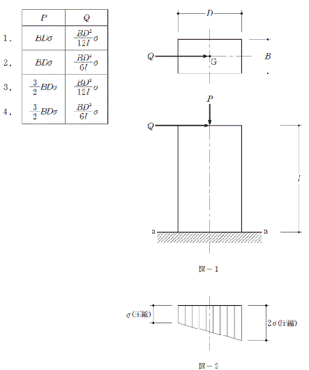 図−1のような底部で固定された矩形断面材の頂部の図心G点に鉛直荷重及び水平荷重が作用するときの底部a−a断面における垂直応力度分布が、図−2に示されている。ととの組合せとして、正しいものは、次のうちどれか。ただし、矩形断面材は等質等断面で、自重は考慮しないものとする。