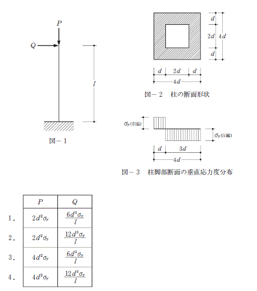 図−1のような脚部で固定された柱の頂部に鉛直荷重及び水平荷重が作用している。柱の断面形状は図−2に示すような箱形断面であり、鉛直荷重の合力及び水平荷重の合力は断面の図心に作用しているものとする。柱脚部断面の垂直応力度分布が図−3のような全塑性状態に達している場合のととの組合せとして、正しいものは、次のうちどれか。ただし、箱形断面は等質等断面とし、降伏応力度はσとする。
