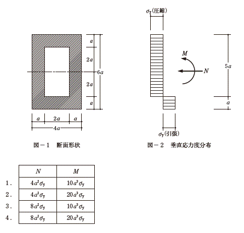 図- のような等質な材料からなる断面が、図- に示す垂直応力度分布となって全塑性状態に達している。このとき、断面の図心に作用する圧縮軸力Nと曲げモーメントMとの組合せとして、正しいものは、次のうちどれか。ただし、降伏応力度はvyとする。