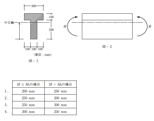 等質で、図-1のような断面形状の部材に、図-2のように断面力として曲げモーメントMのみが作用している。この断面の降伏開始曲げモーメントをMy、全塑性モーメントをMpとするとき、M≦Myの場合とM=Mpの場合の中立軸の位置の組合せとして、正しいものは、次のうちどれか。ただし、中立軸の位置は断面下縁から測るものとする。