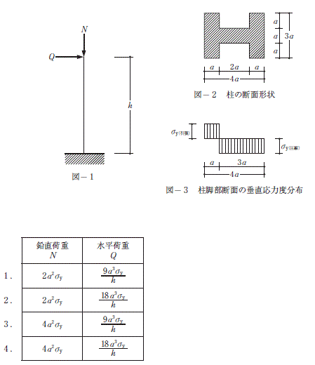 柱脚部断面の垂直応力度分布が図-3のような全塑性状態に達している場合のNとQとの組合せとして、正しいものは、次のうちどれか。ただし、柱は等質等断面とし、降伏応力度はvyとする。