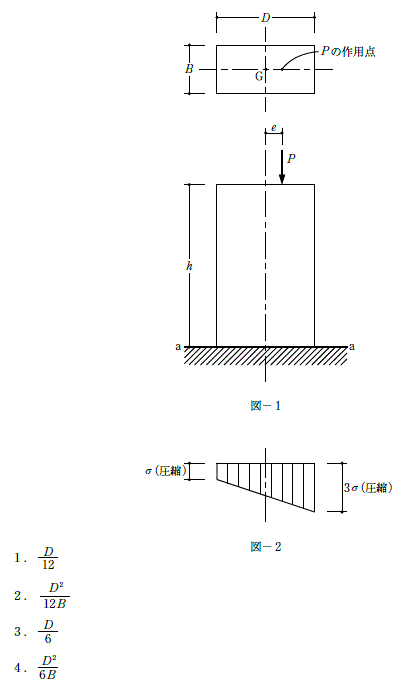 図−1のような底部で固定された矩形断面材の頂部において、図心G点からeだけ離れた点に鉛直荷重Pが作用している。底部(a−a断面)における垂直応力度分布が図−2のようになる場合、距離eとして、正しいものは、次のうちどれか。ただし、BやDに対してhは十分に大きく、矩形断面材は等質等断面とし、自重は無視する。